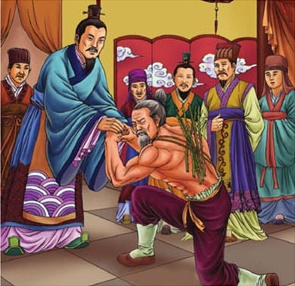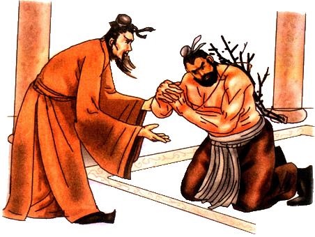 既罢归国,以相如功大,拜为上卿,位在廉颇之右(84)。廉颇曰:“我为赵将,有攻城野战之大功,而蔺相如徒以口舌为劳,而位居我上,且相如素贱人(85),吾羞,不忍为之下。”宣言曰:“我见相如,必辱之。”相如闻,不肯与会。相如每朝时,常称病,不欲与廉颇争列(86)。已而相如出,望见廉颇,相如引车避匿(87)。于是舍人(88)相与(89)谏曰:“臣所以去亲戚而事君者,徒慕君之高义也。今君与廉颇同列,廉君宣恶言而君畏匿之,恐惧殊甚,且庸人尚羞之,况于将相乎!臣等不肖,请辞去。”蔺相如固止之,曰:“公之视廉将军孰与秦王(90)?”曰:“不若也。”相如曰:“夫以秦王之威,而相如廷叱之,辱其群臣,相如虽驽(91),独畏廉将军哉?顾吾念之,强秦之所以不敢加兵于赵者,徒以吾两人在也。今两虎共斗,其势不俱生。吾所以为此者,以先国家之急而后私仇也。”廉颇闻之,肉袒负荆(92),因(93)宾客至蔺相如门谢罪。曰:“鄙贱之人,不知将军(94)宽之至此也。”卒相与欢,为刎颈之交(95)。————(节选)
