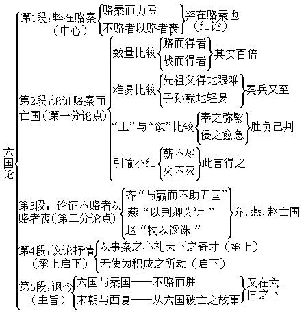 本文为论说文,其结构完美地体现了论证的一般方法和规则,堪称古代论说文的典范。文章开篇即提出六国破灭“弊在赂秦”的论点;然后以史实为据,分别就“赂秦”与“未尝赂秦”两类国家从正面加以论证;又以假设进一步申说,如果不赂秦则六国不至于灭亡,从反面加以论证;从而得出“为国者无使为积威之所劫”的论断;最后借古论今,讽谏北宋统治者切勿“从六国破亡之故事”。文章围绕中心论点展开论证,既深入又充分,逻辑严密,无懈可击。全文纲目分明,脉胳清晰,结构严整。不仅句与句、段与段之间有紧密的逻辑联系,而且首尾照应,古今相映。文中运用例证、引证、假设,特别是对比的论证方法。如“赂者”与“不赂者”对比;秦与诸侯双方土地得失对比,既以秦受赂所得与战胜所得对比,又以诸侯行赂所亡与战败所亡对比;赂秦之频与“一夕安寝”对比;以六国与北宋对比。通过对比增强了“弊在赂秦”这一论点的鲜明性、深刻性。