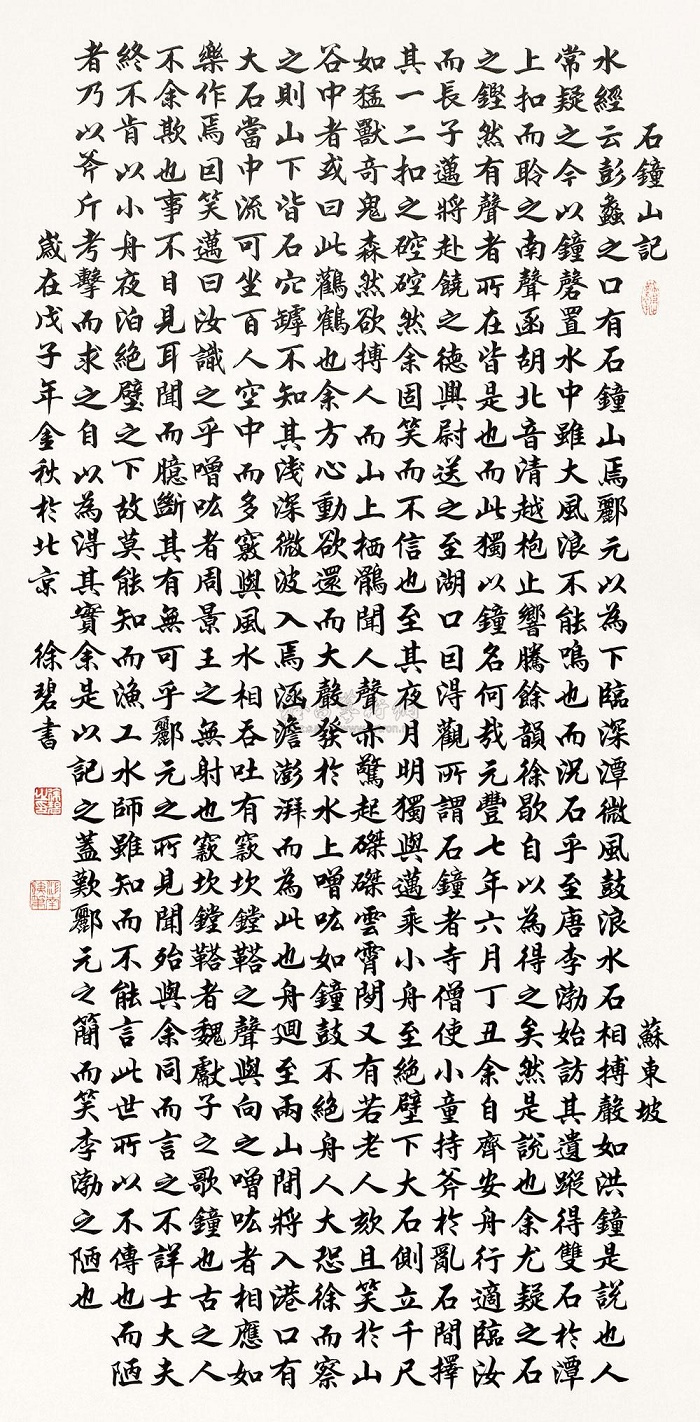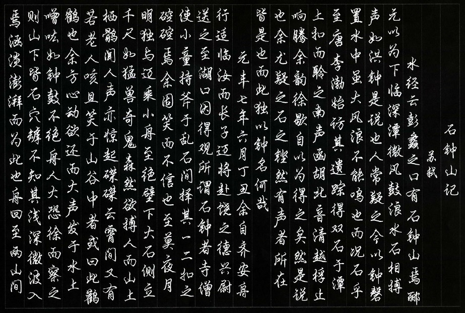 元丰七年六月丁丑,余自齐安舟行适临汝,而长子迈将赴饶之德兴尉,送之至湖口,因得观所谓石钟者。寺僧使小童持斧,于乱石间择其一二扣之,硿硿焉。余固笑而不信也。至莫夜月明,独与迈乘小舟,至绝壁下。大石侧立千尺,如猛兽奇鬼,森然欲搏人;而山上栖鹘,闻人声亦惊起,磔磔云霄间;又有若老人咳且笑于山谷中者,或曰此鹳鹤也。余方心动欲还,而大声发于水上,噌吰如钟鼓不绝。舟人大恐。徐而察之,则山下皆石穴罅,不知其浅深,微波入焉,涵淡澎湃而为此也。舟回至两山间,将入港口,有大石当中流,可坐百人,空中而多窍,与风水相吞吐,有窾坎镗鞳之声,与向之噌吰者相应,如乐作焉。因笑谓迈曰:“汝识之乎?噌吰者,周景王之无射也;窾坎镗鞳者,魏庄子之歌钟也。古之人不余欺也!”